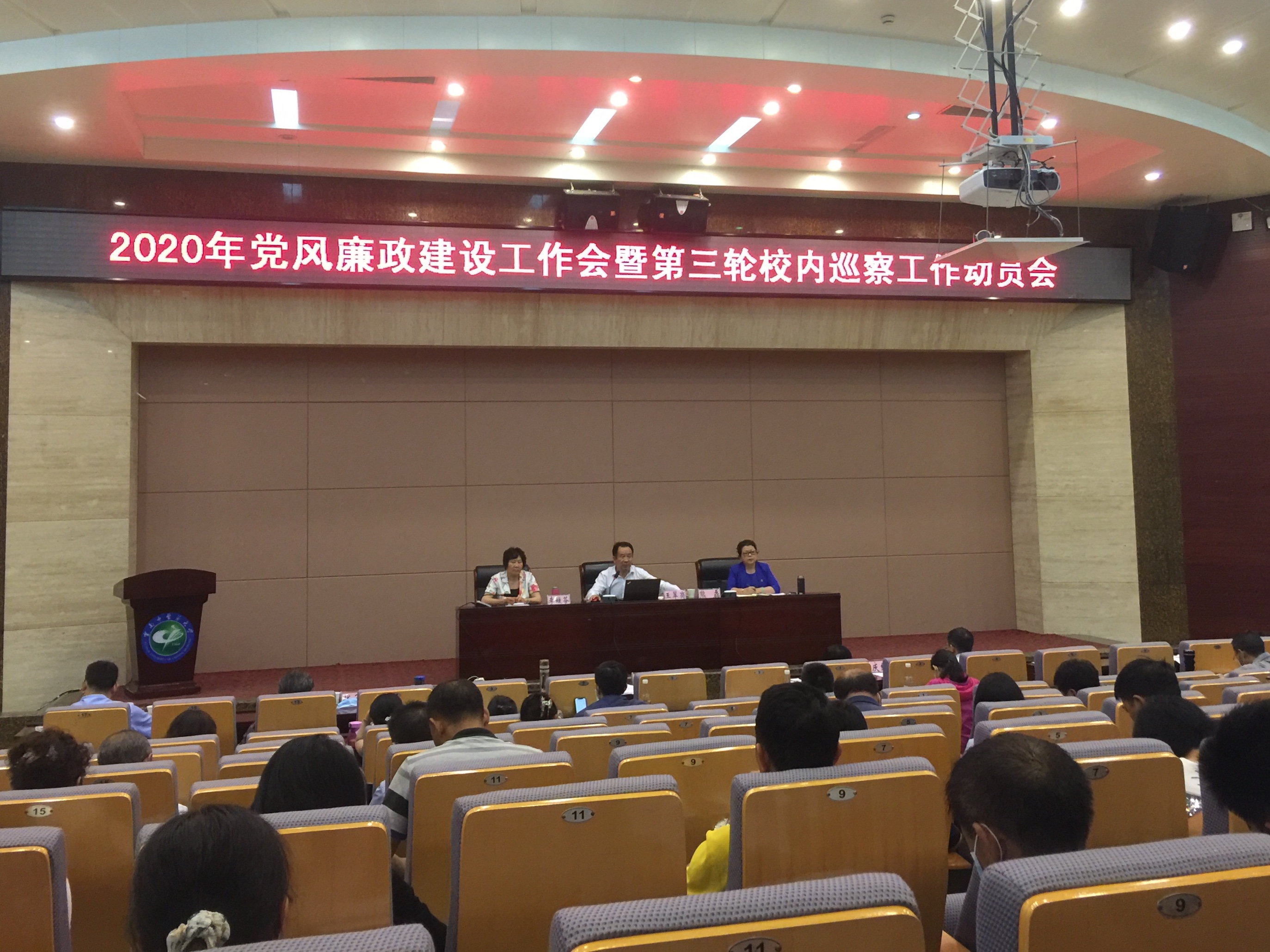 6月17日上午,学校2020年党风廉政建设工作会暨第三轮巡察工作动员会在呈贡校区翰墨楼一楼报告厅召开,校领导、呈贡校区科以上干部、重点部门全体人员、民主党派基层组织负责人、党风廉政义务监督员、廉政教育兼职教师、基层党组织纪检委员、学生代表及第三轮巡察全体工作人员200余人参加会议。校党委书记王翠岗、校纪委书记李媛芬出席会议并讲话,党委副书记、校长熊磊主持会议。